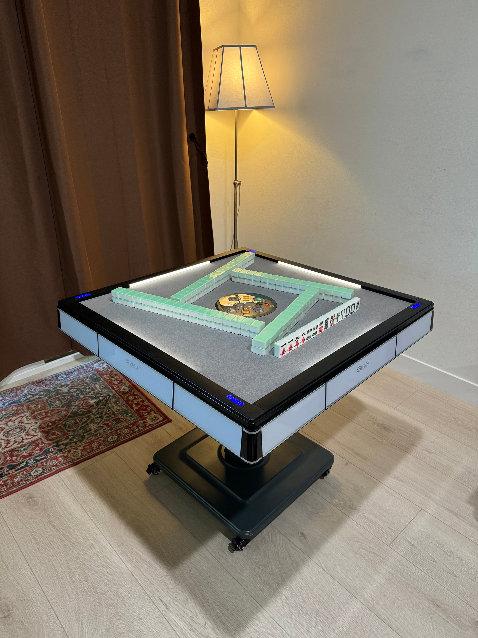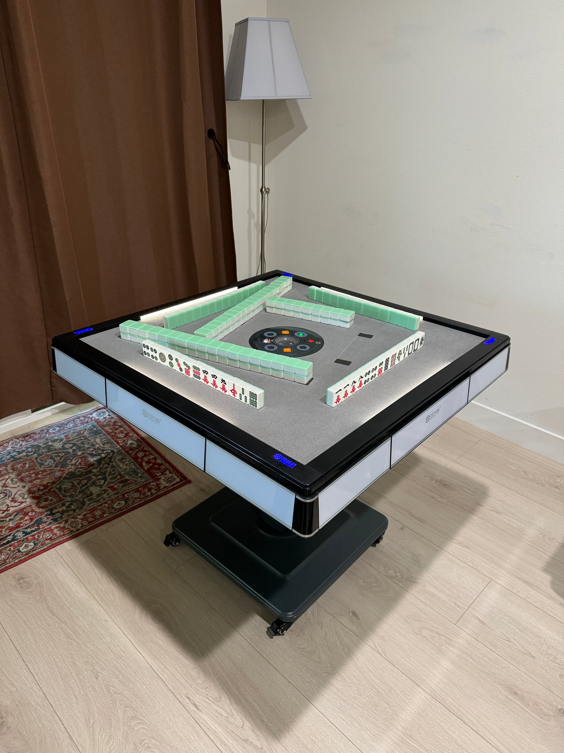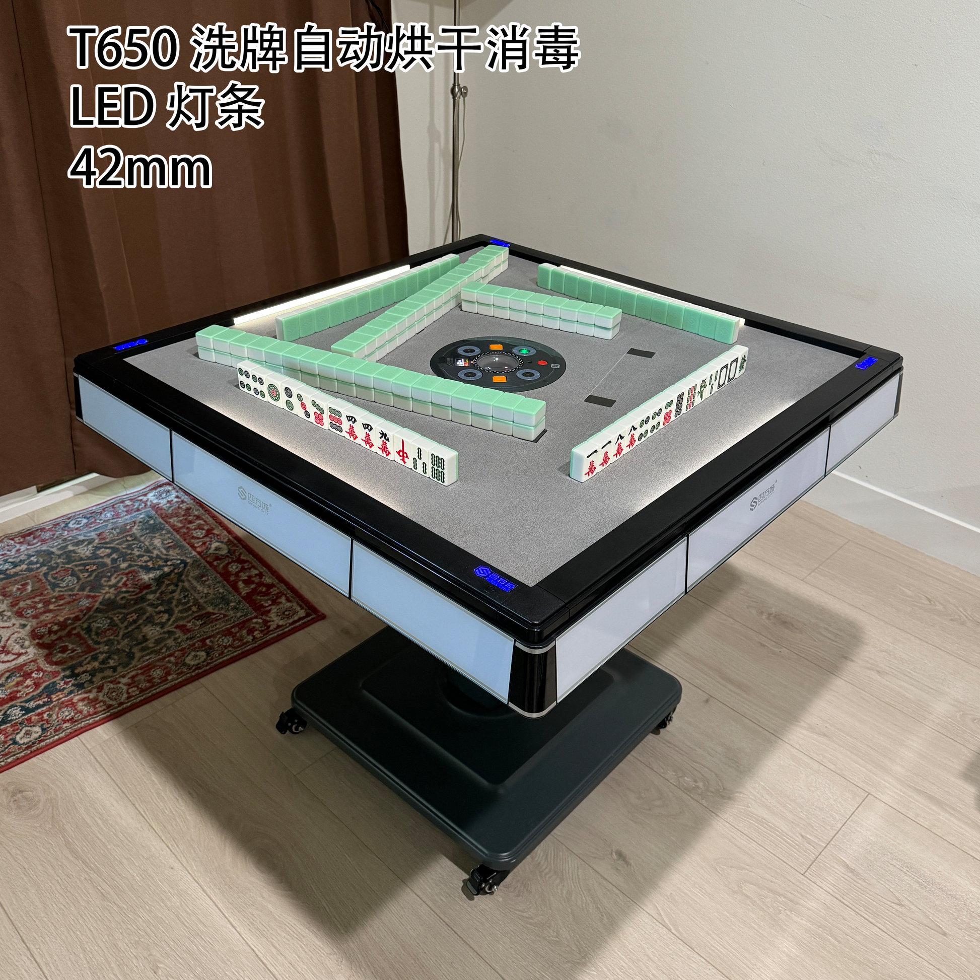 T650 珍珠白 LED灯条款 ,曲水纹灰桌面,可折叠,洗牌自动烘干消毒,两颗色子(36号3颗,42,46两颗)标配两幅玉石麻将牌